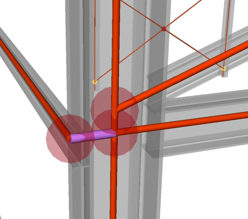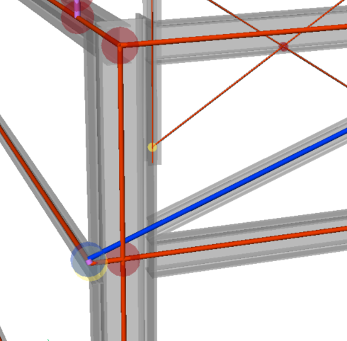 Im BIMANALYTICALMODEL liegt ein Knoten immer genau auf jeder verbundenen Achse. Exzentrizitäten werden mit expliziten visuellen starren Verbindungen modelliert (lila Balken in der Vorschau). Während des Exports wird jeder Cluster von BricsCAD® Knoten, die mit starren Verbindungen verbunden sind, in einen einzelnen Verbindungsknoten mit Exzentrikitäten in CIS/2 und IFC übersetzt.