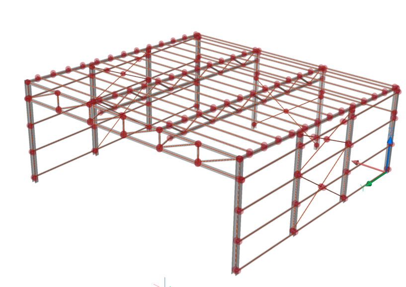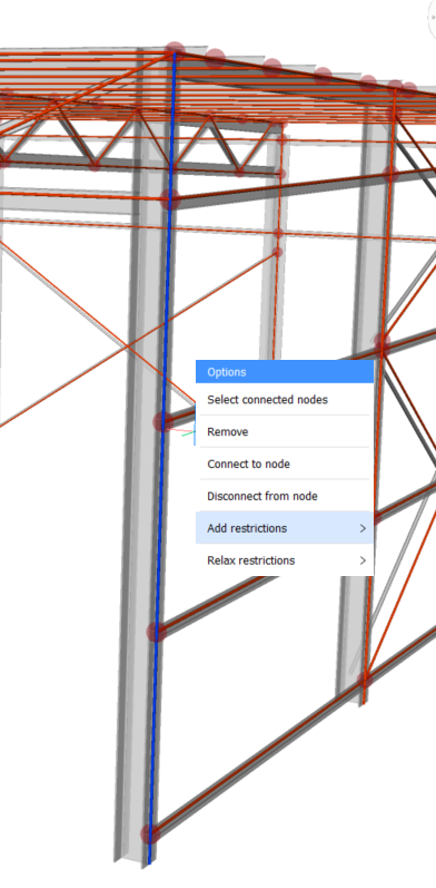 - Die einzigen zusammenfallenden Knoten, die übrig sind, befinden sich am vorderen Fachwerk der Hangarstruktur. Wenn Sie einen Blick auf die Seite des vorderen Fachwerks werfen, sehen Sie, dass ein geneigtes Element nicht mit der Säule, sondern mit dem horizontalen Träger verbunden ist.