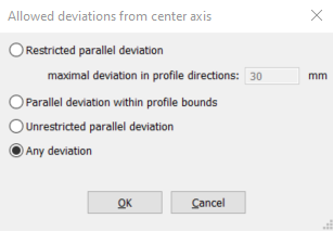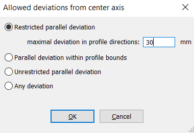 Um dies zu vermeiden, starten Sie den Befehl mit einer etwas flexibleren Einstellung neu. Wählen Sie im Fenster Zulässige Abweichungen von der Mittelachse erneut Eingeschränkte Parallel Abweichung, diesmal jedoch mit einem maximalen Abweichung in Profilrichtungen von 30 mm.