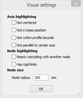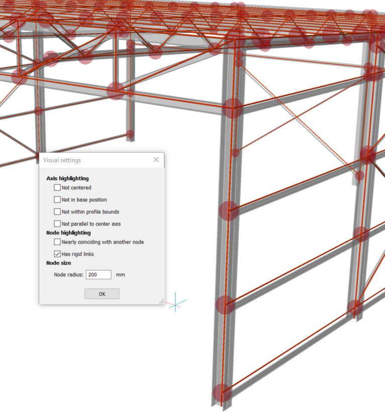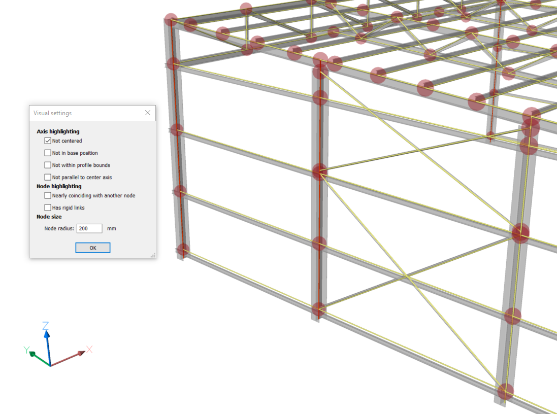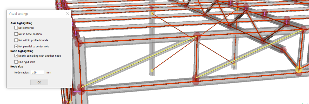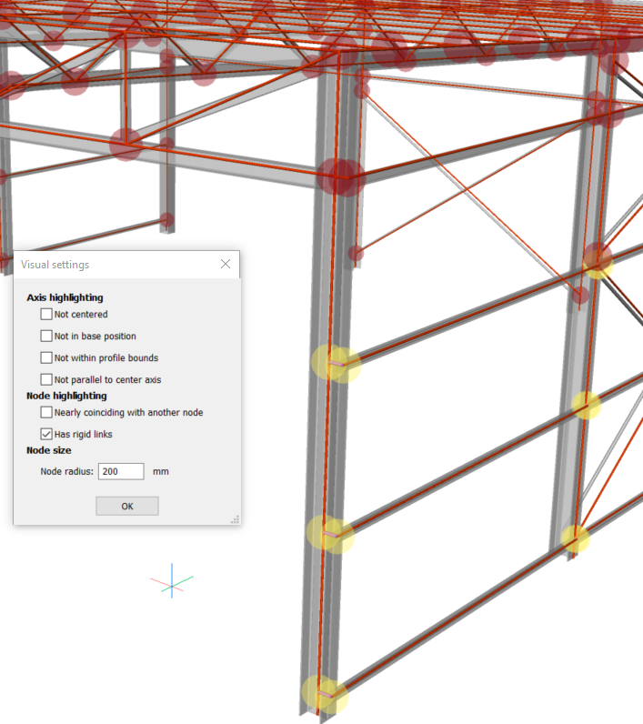Außerdem wird das Fenster mit den visuellen Einstellungen angezeigt. In diesem Fenster können Sie verschiedene Achsen und Knoten markieren und die Achsen und Knoten, die diesen Features entsprechen, hervorheben (gelb). Auf diese Weise können Sie die aktuellen Eigenschaften der Achse und der Knoten des analytischen Modells untersuchen. Basierend auf Ihren Erkenntnissen können Sie feststellen, ob Anpassungen vorgenommen werden müssen. Sie können auch die Größe der Scheiben ändern, die die Knoten darstellen. Dies ist in Kombination mit der Knotenhervorhebung nützlich, die zum Beispiel verwendet werden kann, um fast zusammenfallende Knoten zu finden.