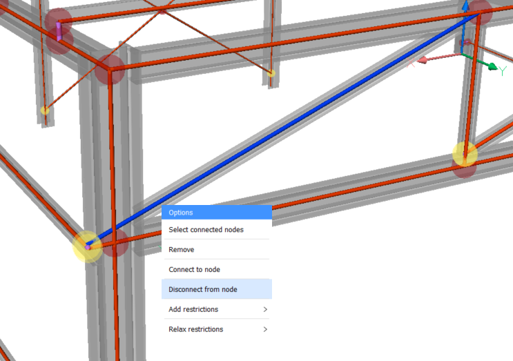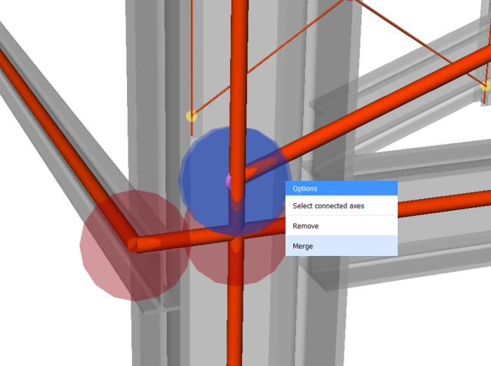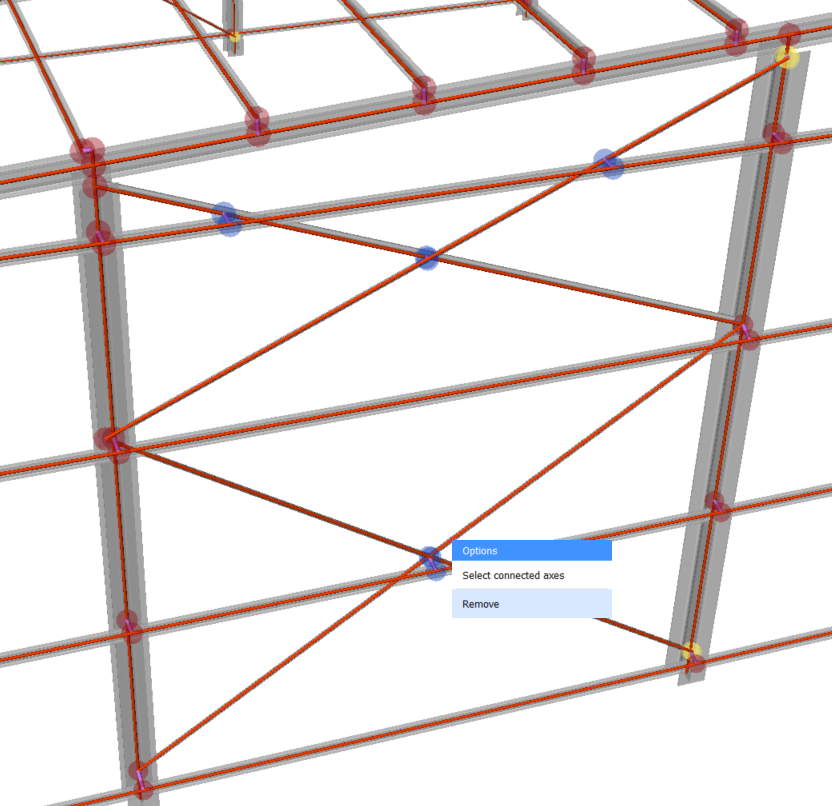 - Für die Erkennung von Knoten in der Vorschau des analytischen Modells wird die Nähe von Strukturelementen verwendet. Daher ist es möglich, dass Knoten in dem Modell entstehen, an denen sich Spurstangen kreuzen. Sie können diese Knoten einfach entfernen, indem Sie auf den Knoten klicken und Entfernen auswählen.Anmerkung: Sie können mehrere Knoten gleichzeitig auswählen, indem Sie die Rahmenauswahl verwenden.