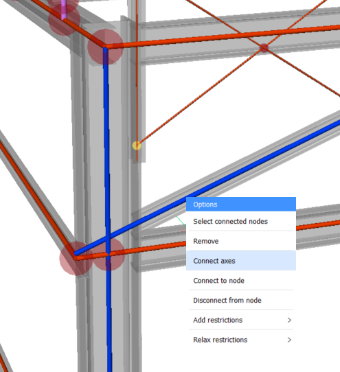 Im BIMANALYTICALMODEL gibt es für jedes physische Element eine einzelne Achse. Eine Achse kann an mehr oder weniger als zwei Knoten angeschlossen werden. Während des Exports wird eine Achse, die entlang ihrer Länge mehrere Knoten aufweist, für den CIS/2- und IFC-Export in mehrere Statikelemente mit jeweils einem End- und einem Startknoten aufgeteilt.