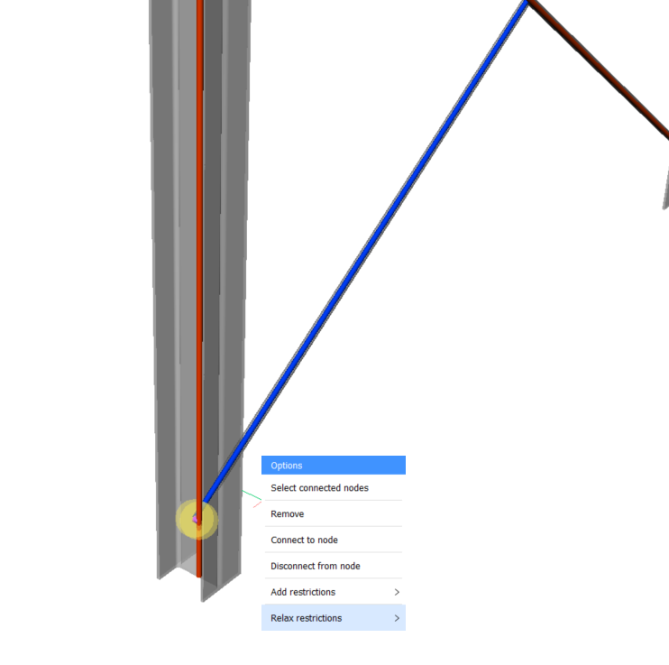 - In der interaktiven Vorschau des analytischen Modells wurden die Säulenachsen in Richtung der Profilgrenzen verschoben. In diesem Schritt zentrieren Sie die Achse der Säulen. Klicken Sie dazu auf die Achse der Säule, klicken Sie auf Einschränkungen hinzufügen und dann auf Zur Mitte. Dadurch werden starre Verbindungen sehr lokal eingeführt.