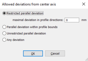 In diesem Fenster können Sie den Freiheitsgrad festlegen, der beim Generieren eines analytischen Modells verwendet wird. Wenn Sie den Mauszeiger über eine der Optionen bewegen, wird in einer Tooltipp angezeigt, welche Einschränkungen für diese Option gelten. Wählen Sie in diesem Fall die Option Eingeschränkte Parallel Abweichung mit einer maximalen Abweichung in Profilrichtungen von 0 mm. Keine Achse darf von ihrer zentralen Position im Profil abweichen.