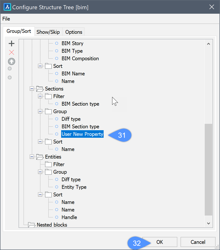 5. Drücken Sie OK (32), um die Eigenschaft zum Gruppieren von Objekte im Panel Struktur zu verwenden.