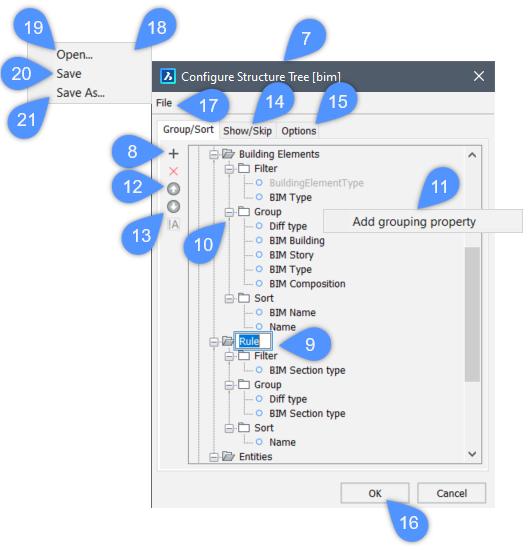 Die Baumstruktur des Panels Struktur stellt den hierarchischen Regelsatz in grafischer Form dar. Jede Regel verfügt über eine Filtereigenschaft, eine Gruppierungseigenschaft und eine Sortiereigenschaft. Durch das Organisieren der Eigenschaften im Panel Struktur verbessern Sie unter anderem die Leistung Ihres Projekts beim Abfragen der Objekte. Wenn Sie über eine Baumstruktur für Ihr BIM-Modell verfügen, können Sie eine Hierarchie über die Bauelementtypen, Gebäude, Geschosse usw. erstellen. Mithilfe der Hierarchie können Sie die Eigenschaften auf verschiedenen Ebenen der Datenanzeige verwalten.