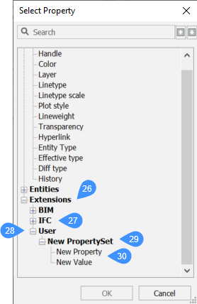 Das folgende Bild zeigt die Namensbereiche IFC (27) und User (28) in der Dialog Eigenschaft auswählen.