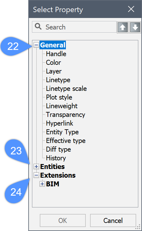 In BricsCAD® können die benutzerdefinierten Eigenschaften über die GUI im Dialog Eigenschaft auswählen hinzugefügt werden. Der Dialog Eigenschaft auswählen bietet eine Liste dynamischer Eigenschaften für die Zeichnung basierend auf dem aktuellen Arbeitsbereich. Beachten Sie, dass benutzerdefinierte Eigenschaften über den Dialog Eigenschaft auswählen zum Gruppieren der Baumstruktur verwendet werden können.