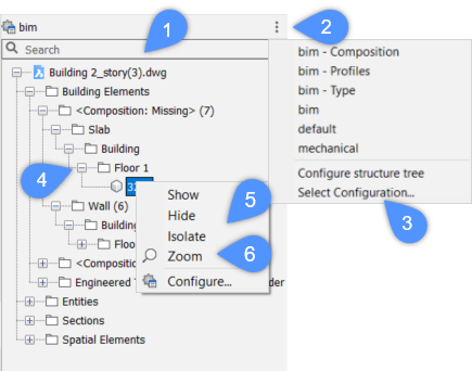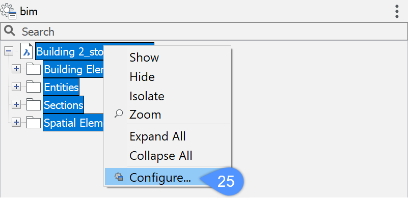 Das Panel Struktur ist ein interaktiver Strukturbaum, der alle Objekte im aktuellen Modell anzeigt. Die Art und Weise, wie die Objekte im Panel angezeigt werden, hängt von der ausgewählten Konfiguration ab. Bei BIM ist die vorausgewählte Konfiguration die vordefinierte bim CST-Datei. Sie können diese Konfiguration über den Dialog Strukturbaum konfigurieren bearbeiten. Nachdem Sie den Strukturbaum konfiguriert haben, können Sie diese Konfiguration einfach als neue CST-Datei speichern. Standardmäßig werden die CST-Dateien im Support-Ordner gespeichert.