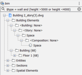 4. Ausdrücke können komplexer sein, z. B. das Filtern nach mehreren Eigenschaften. Sie können beispielsweise $type = wall and height > 5000 eingeben, um nach allen Wänden mit einer Höhe über 5000 mm zu filtern.
