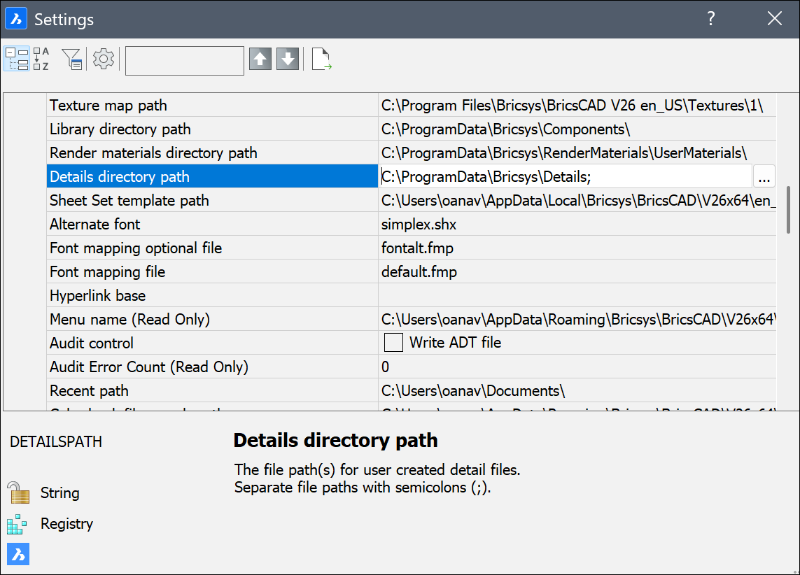 - Set the DETAILSPATH system variable. Go to the Details panel and select to quickly open the Settings dialog box.
