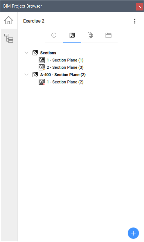 Schnittindikatoren werden für jeden Schnitt angezeigt, der sich mit dem Ausgangsschnitt überschneidet, wenn der Ausgangsschnitt ein Plan ist. Sie werden auf dem speziellen Layer BIM_SECTIONS gespeichert. Schalten Sie den Layer ein oder aus, um die Sichtbarkeit der Indikatoren zu steuern.
