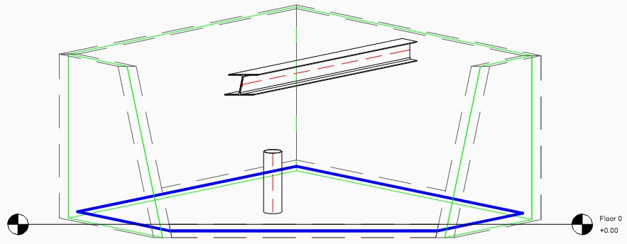 - Die Mittenanpassung definiert das Aussehen des Zentrums von planaren oder linearen Objekten. Die resultierenden Mittellinien, beispielsweise durch Schneiden der Mittelebene einer Wand in einem Grundriss, können angepasst werden.