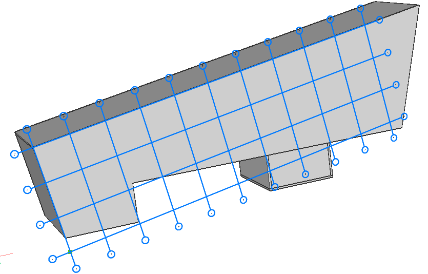 - Verwenden Sie den Befehl BIMRASTER, um ein Raster auf der Wandfläche zu erstellen. Wählen Sie die Grundmaße in der Befehlszeile aus. Durch Ändern der Optionen für U-Linie und V-Linie können Sie die gewünschte Größe und Anzahl der Paneele auf der Oberfläche angeben.Anmerkung: Um auf der Fläche zu zeichnen, stellen Sie sicher, dass Sie zuerst die Fläche hervorheben und dann klicken, um mit dem Zeichnen zu beginnen. Andernfalls wird das Raster in der XY-Ebene erstellt.