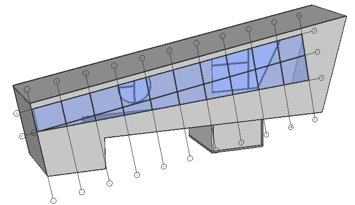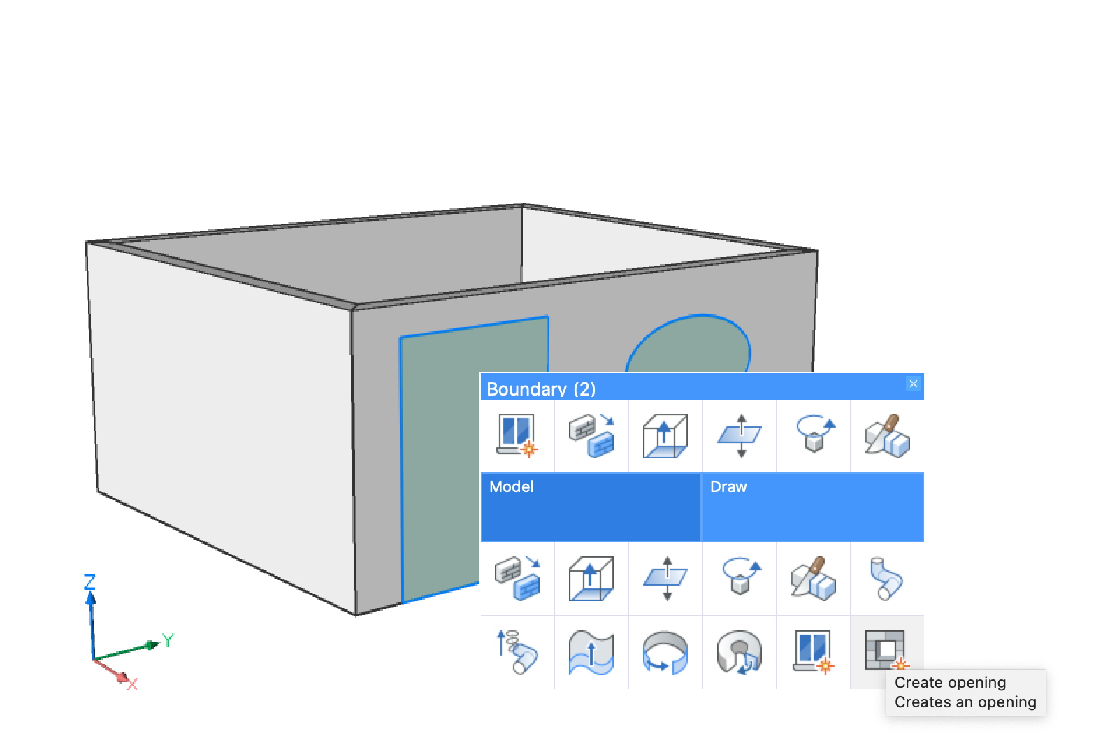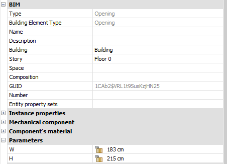 Anmerkung: Wenn Ihre geschlossene Kontur eine Rechteckform hat, enthält das Öffnungselement die Parameter Breite und Höhe.Anmerkung: Öffnungselemente enthalten Subtraktionskörper. Um den Subtraktionskörper anzuzeigen, öffnen Sie das Panel Layer und wählen Sie den Layer BIM_SUBTRACT aus.Anmerkung: Die assoziativen Bezeichner können mit dem Befehl BIMBEZEICHNER für das Öffnungselement in einer Schnittzeichnung generiert werden.