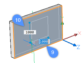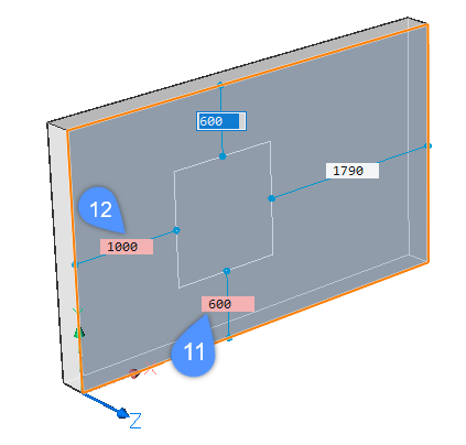 Geben Sie einen Wert in das gewünschte Feld für die dynamische Bemaßung ein und drücken Sie die Taste Tab, um zum nächsten Feld zu springen. Das Feld für die Bemaßung wird rot, um darauf hinzuweisen, dass es gesperrt ist (11, 12).