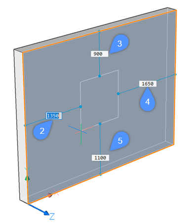 Die Volumenkörperflächen werden hervorgehoben und die Abstände der Einfügungen zu den nächstgelegenen parallelen Kanten des übergeordneten Volumenkörpers (2, 3, 4, 5) werden angezeigt:
