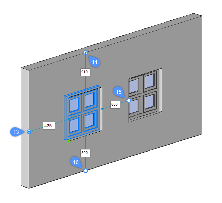 Die Abstände zwischen den Einfügungen und den nächstgelegenen parallelen Kanten des Volumenkörpers werden angezeigt, ebenso wie die jeweiligen Bezugspunkte (13, 14, 15, 16):