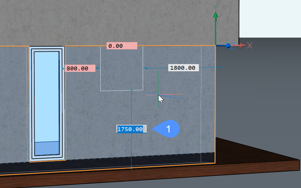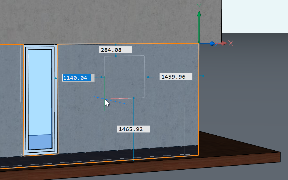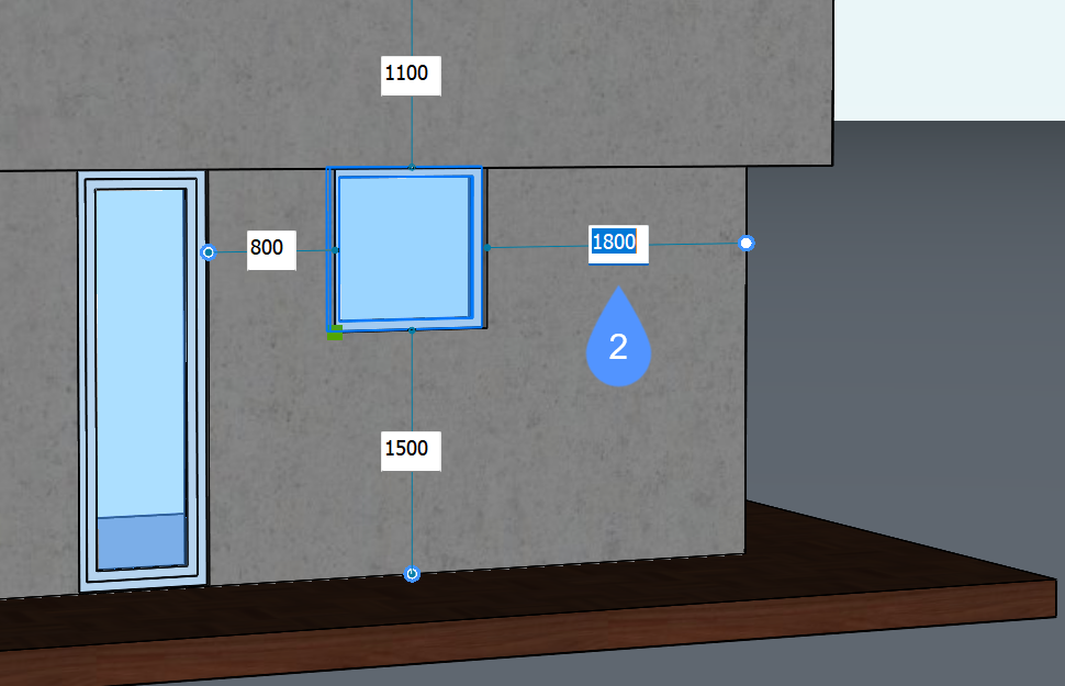 - (Optional) Sobald Sie ein Fenster erstellt haben, können Sie die Position anpassen, indem Sie das Fenster auswählen und dann auf die Bemaßungslinien klicken und die Bemaßungen bearbeiten (2).