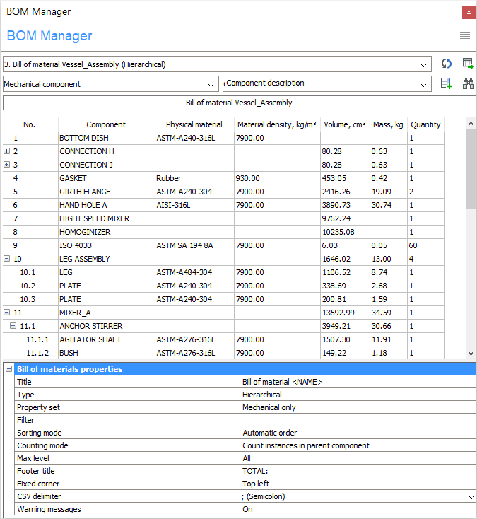 Im Panel Stücklisten-Manager können Sie Stücklisten (BOM) in der aktuellen Zeichnung durchsuchen, erstellen und bearbeiten. Verwenden Sie den Manager, um sowohl neue als auch bestehende Stücklisten interaktiv zu konfigurieren. Sie können die Konfiguration einer Stückliste als Vorlagendatei speichern und sie später in anderen Zeichnungen wiederverwenden. Sie können auch eine Stückliste hinzufügen, die nicht mit einer Tabelle in der Zeichnung verknüpft ist.