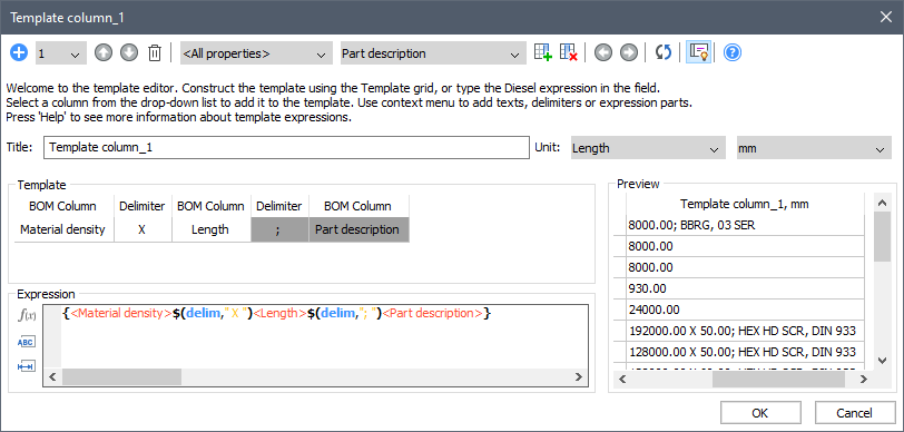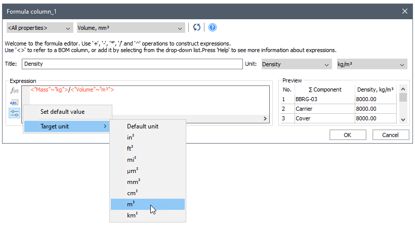 In Formel- und Vorlagenausdrücken wurde ihre Syntax erweitert, sodass die Zieleinheit für Variablen festgelegt werden kann (sofern die Variable eine Einheitenumrechnung unterstützt). Es ermöglicht das Schreiben von einheitenabhängigen Formeln (z. B. Dichteberechnung), ohne die anfängliche Einheit der Variablen zu berücksichtigen.