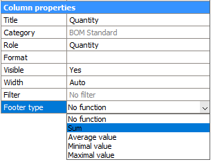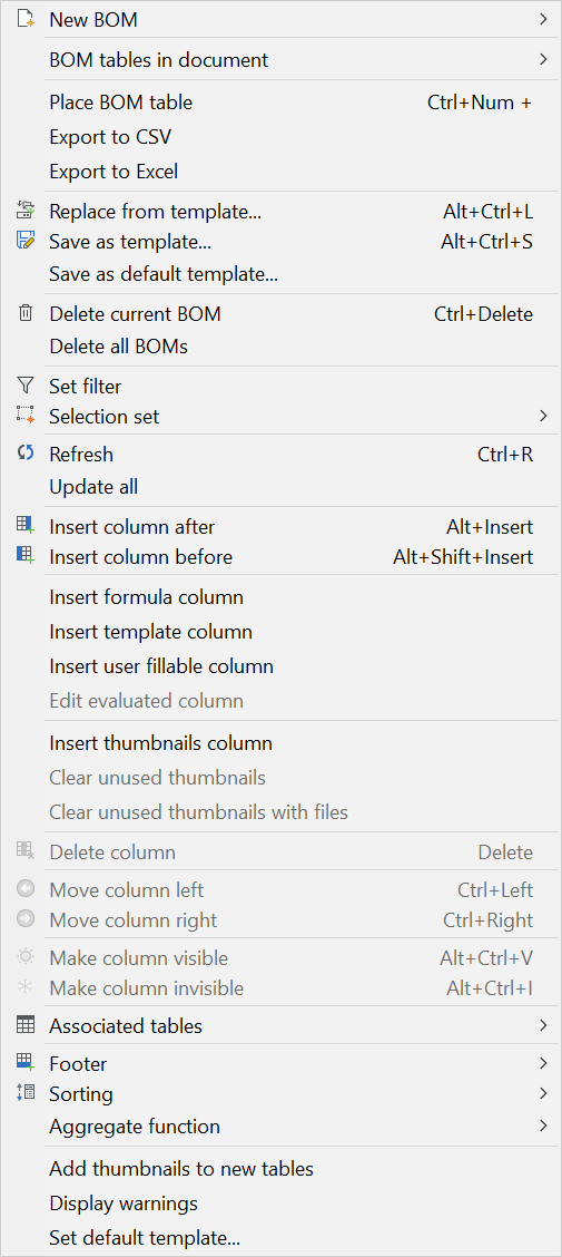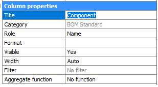 Die meisten Konfigurationsvorgänge im Manager sind im Hauptmenü verfügbar. Für ausgewählte Spalten oder Zeilen ist ein Kontextmenü verfügbar. Sie können auch die Eigenschaften der ausgewählten Spalten und die Stückliste selbst im Eigenschaftenbereich des Managers ändern. Um mit einer bestimmten Spalte zu arbeiten, wählen Sie sie im Stückliste-Raster aus. Es können mehrere Spalten gleichzeitig ausgewählt werden.