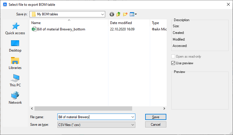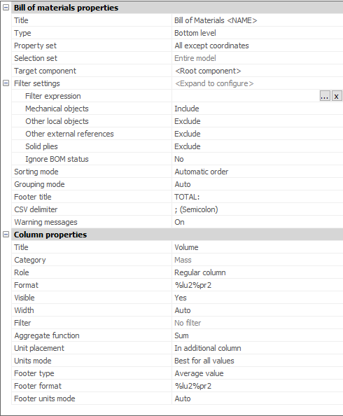 - Speichern Sie die Stücklistenkonfiguration als Vorlagendatei oder als Standardvorlagendatei (gespeichert in der Systemvariablen BOMTEMPLATE).