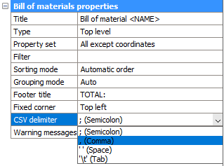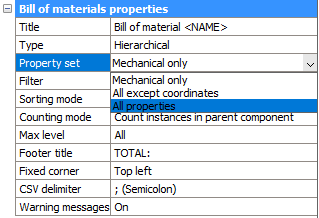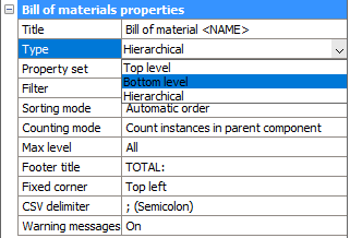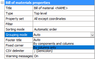 Ändern Sie die Eigenschaft Gruppierungsmodus im Abschnitt Stücklisten-Eigenschaften des Eigenschaftenrasters.