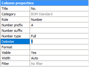 Wählen Sie die hinzuzufügende Eigenschaft aus der Liste der verfügbaren Spalten aus. Diese Liste enthält alle Spalten aus der ausgewählten Kategorie, die der Stückliste noch nicht hinzugefügt wurden. Wenn Sie mit der Eingabe des Feldnamens beginnen, schlägt BricsCAD® automatisch Namen vor. Klicken Sie auf den Namen, um ihn aus der Liste auszuwählen.