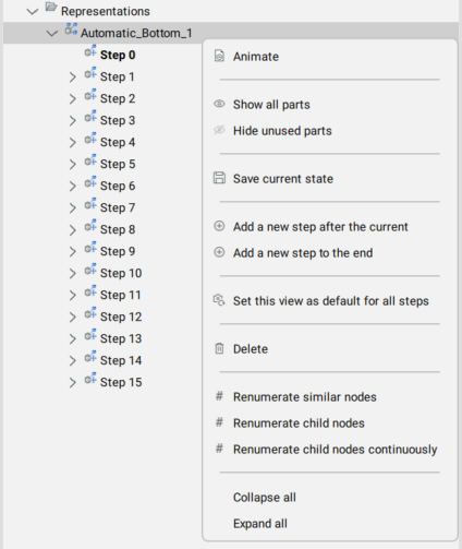 Darstellungen können einen oder mehrere Schritte enthalten, die eine bestimmte Zusammenbau- oder Zerlegungssequenz beschreiben. Jeder Schritt entspricht einem Satz von Bauteilen, die in diesem bestimmten Arbeitsschritt bewegt werden müssen, um die Hauptbaugruppe zusammenzubauen oder zu zerlegen. Alle Darstellungsalgorithmen erstellen automatisch alle erforderlichen Schritte. Sie können auch Schritte löschen, zusammenführen, teilen, verschieben oder zusätzliche Schritte hinzufügen.
