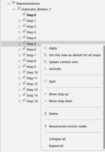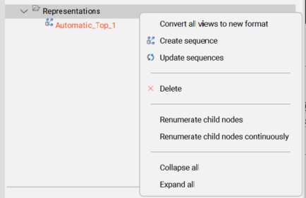 Öffnen Sie den Mechanical Browser, um alle Darstellungen im Dokument zu sehen. Alle Darstellungen und Sequenzen werden in der Gruppe Darstellungen aufgeführt. Öffnen Sie das Kontextmenü für die ausgewählten Darstellungen, um alle unterstützten Operationen in diesem Kontext zu sehen: