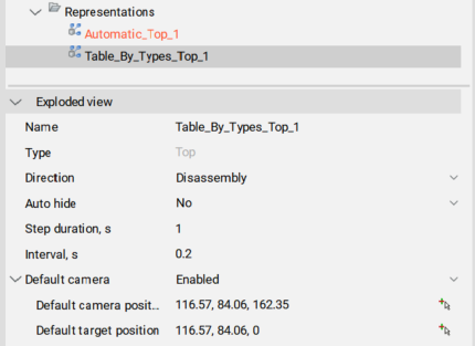 Anmerkung: Falls konfiguriert, wird die benutzerdefinierte Kamera des aktuellen Schritts verwendet. Andernfalls, falls diese Option aktiviert ist, wird die Standardkamera des Explosionsansichts verwendet, und wenn nicht, wird die aktuelle Kamera verwendet.