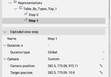 Wenn einem Schritt keine bestimmte Kameraposition zugeordnet ist, übernimmt er die Kameraposition vom ersten Schritt. Bei neu erstellten Explosionsansichten erhält der erste Schritt die gleiche Kameraposition wie das Modell.