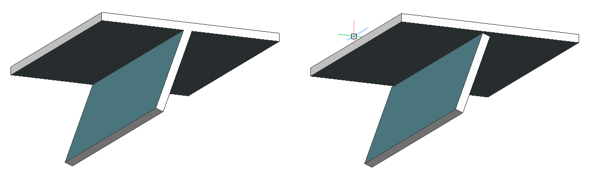 Wenn ein T-Zunge-Feature gelöscht wird, stellt BricsCAD ein T-Verbindung-Feature mit der entsprechenden Geometrie wieder her. Das Löschen einer T-Verbindung verbindet die Laschen und erzeugt eine T-förmige harte Kante zwischen ihnen.