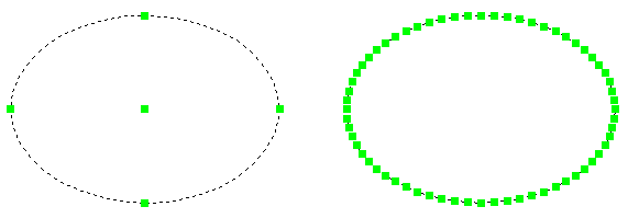 Der Unterschied zwischen einer echten Ellipse und einer Polylinienrepräsentation einer Ellipse ist sichtbar, wenn Sie die Ellipse auswählen. Eine echte Ellipse hat fünf Griffpunkte: Den Mittelpunkt und die Endpunkte der Achsen. Eine Polyliniendarstellung einer Ellipse ist eine geschlossene Polylinie, die aus Bogensegmenten besteht.