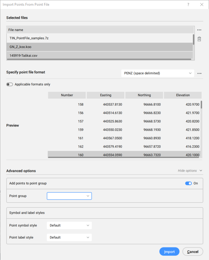- Klicken Sie auf die Schaltfläche Import, um Civil-Punkte zu importieren.Anmerkung: Wenn kein Filter angegeben ist oder keine Punktgruppe ausgewählt ist, werden die Punkte standardmäßig in der Gruppe _All points platziert.