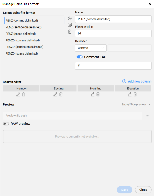 Im Dialog Punktdateiformate verwalten können Sie Punktdateiformate erstellen, bearbeiten und löschen.