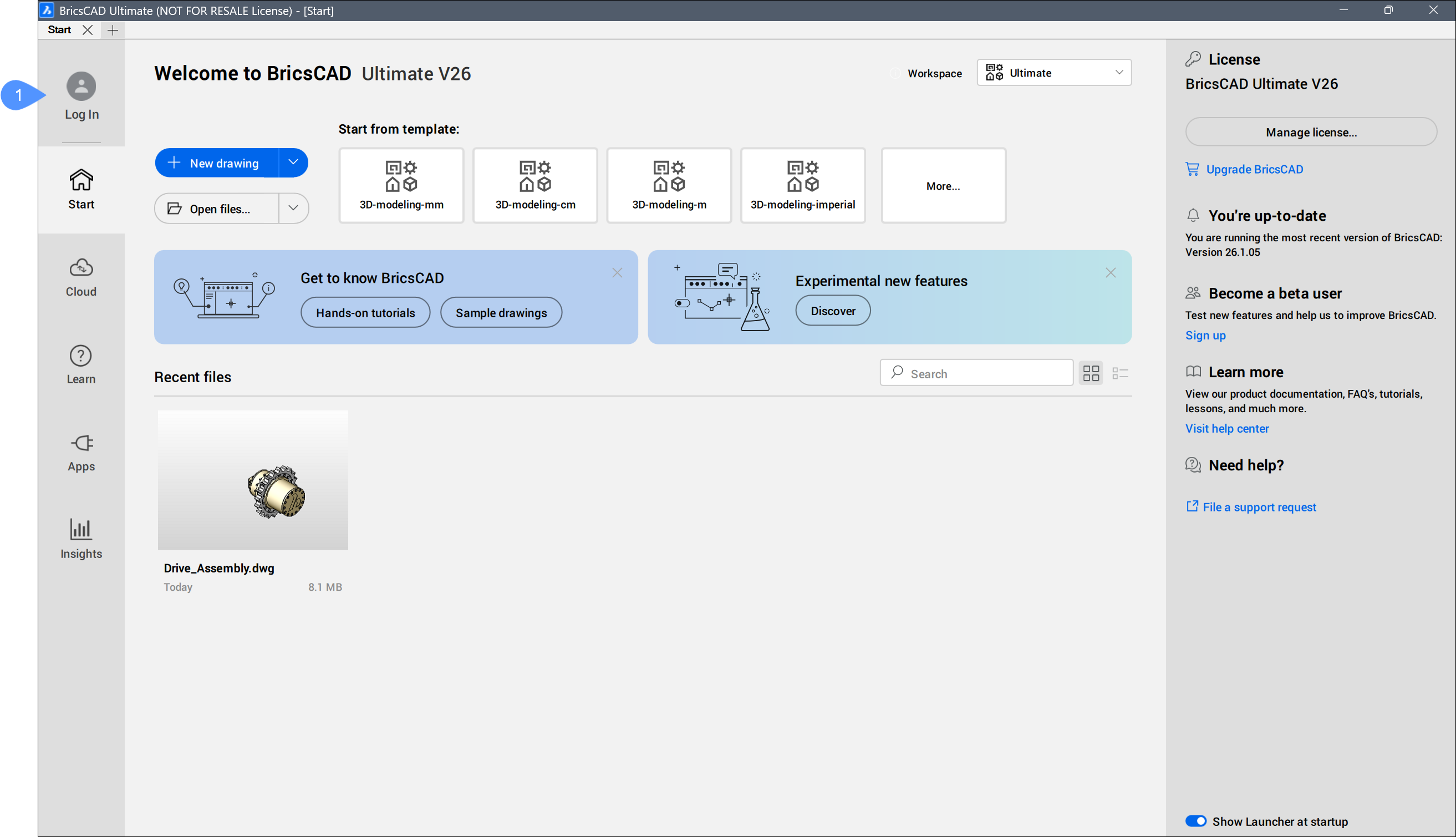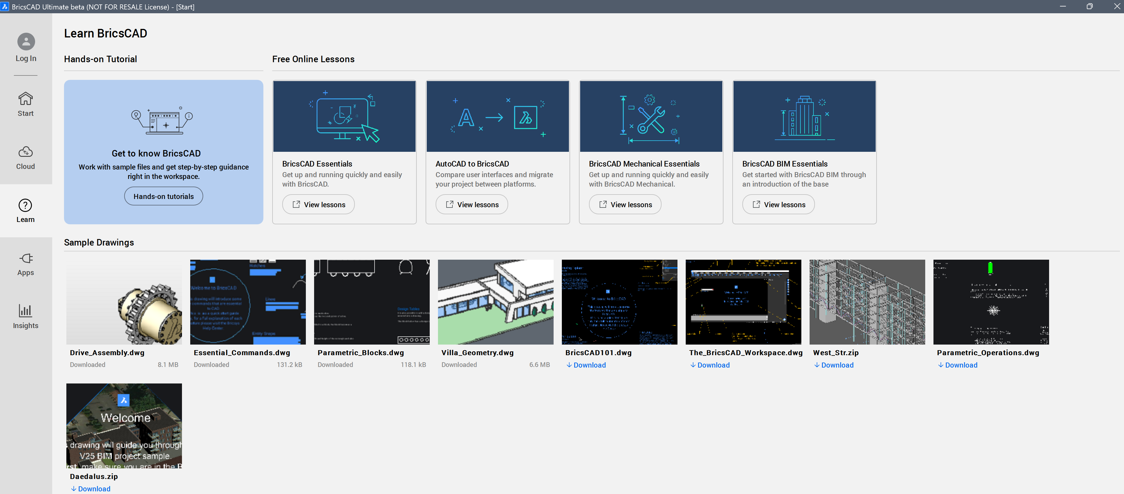 - Bietet eine Schritt-für-Schritt-Anleitung für die Verwendung von BricsCAD® im ausgewählten Arbeitsbereich. Der Befehl TUTORIALSÖFFNEN wird gestartet.Anmerkung: Die Systemvariable TUTORIALSONSTARTPAGE steuert die Anzeige dieser Option.