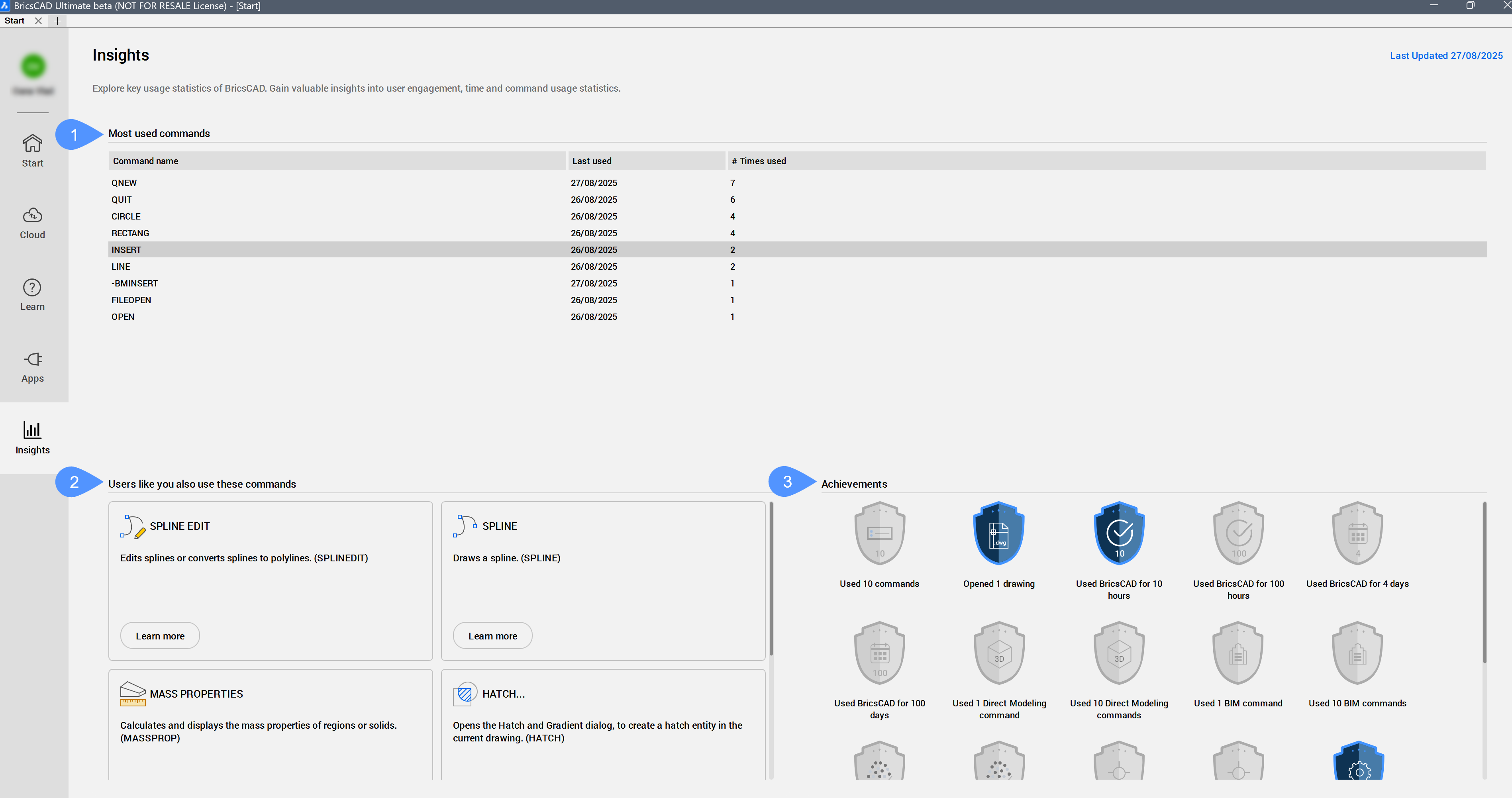 Die Registerkarte Einblicke enthält eine Übersicht Ihrer am häufigsten verwendeten Befehle, Befehle, die für Sie interessant sein könnten, und Errungenschaften.