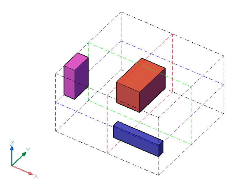 Die farbigen Rahmen sind die Begrenzungsrahmen der ausgewählten Objekte. Für jedes Objekt in der Auswahl gibt es sechs äußere Begrenzungen, die durch die Flächen definiert sind, und drei zentrierte Begrenzungen. Die Begrenzungen eines Objekts werden ähnlich wie die des Begrenzungsrahmens der Auswahl definiert.