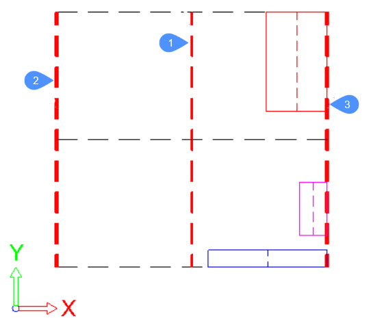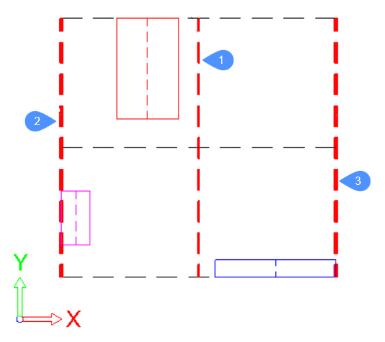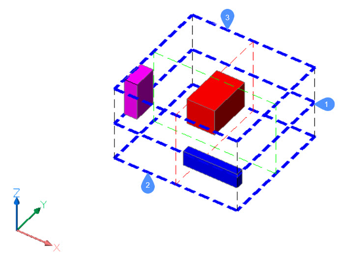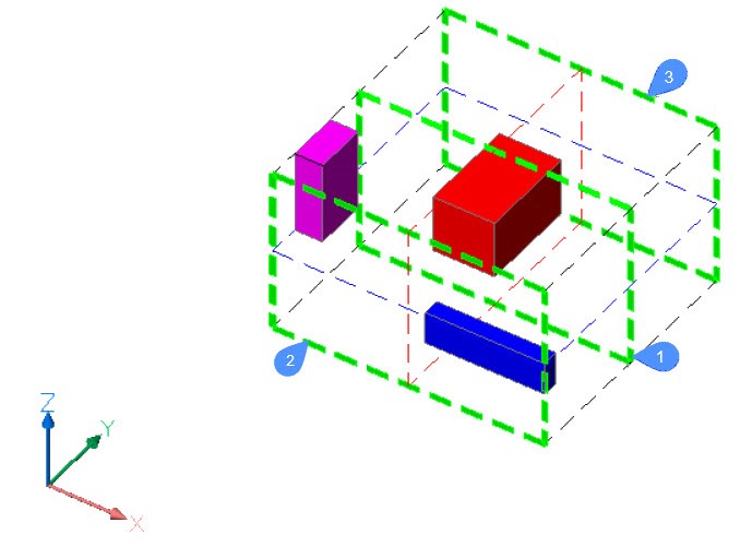 - Der Auswahlsatz von Objekten hat insgesamt neun Begrenzungen. Für jede der Achsen des BKS gibt es drei Begrenzungen. Die Bezeichnungen dieser Begrenzungen lautet für jede Achse 1 (Zentrum), 2 (Unten) und 3 (Oben).