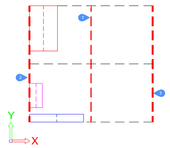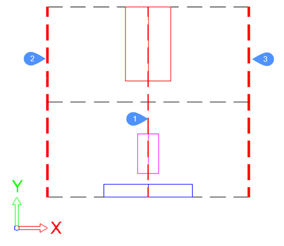 Für jedes Objekt in der Auswahl wird sein Begrenzungsrahmen durch durchgehende Linien dargestellt, die jeweils eine andere Farbe haben. In diesem Fall sind die Begrenzungen 2 (Unten), 1 (Zentrum) und 3 (Oben) für jedes Objekt die linke Seite, die Mittellinie bzw. die rechte Seite seines Begrenzungsrechtecks.