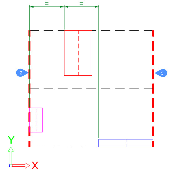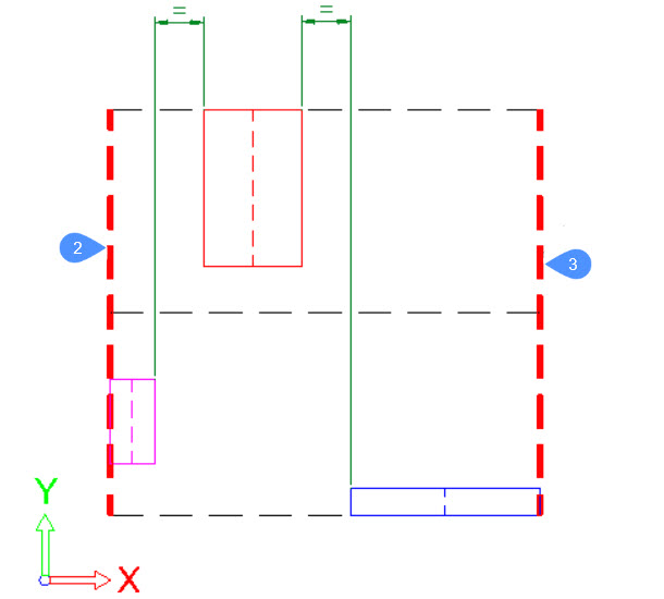Um eine neue Konfiguration der ausgewählten Objekte zu erstellen, verwendet der Befehl ARRANGE einige Grenzen. Zunächst gibt es die Hauptbegrenzungen, die mit dem Begrenzungsrahmen der Auswahl verknüpft sind. Dann gibt es die sekundären Begrenzungen, die mit den Begrenzungsrahmen der einzelnen Objekte in der Auswahl verknüpft sind.