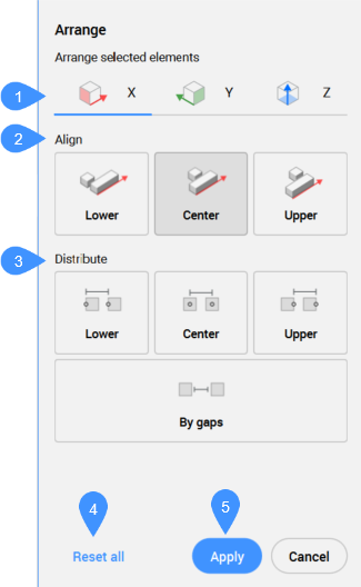 - AnwendenAnmerkung: Die Optionen innerhalb des Befehls entsprechen den Optionen im Befehlskontext-Panel Anordnen.Anmerkung: Die Befehlszeile kann weiterhin verwendet werden, um die ausgewählten Objekte anzuordnen, während das Befehlskontext-Panel Anordnen aktiv ist.