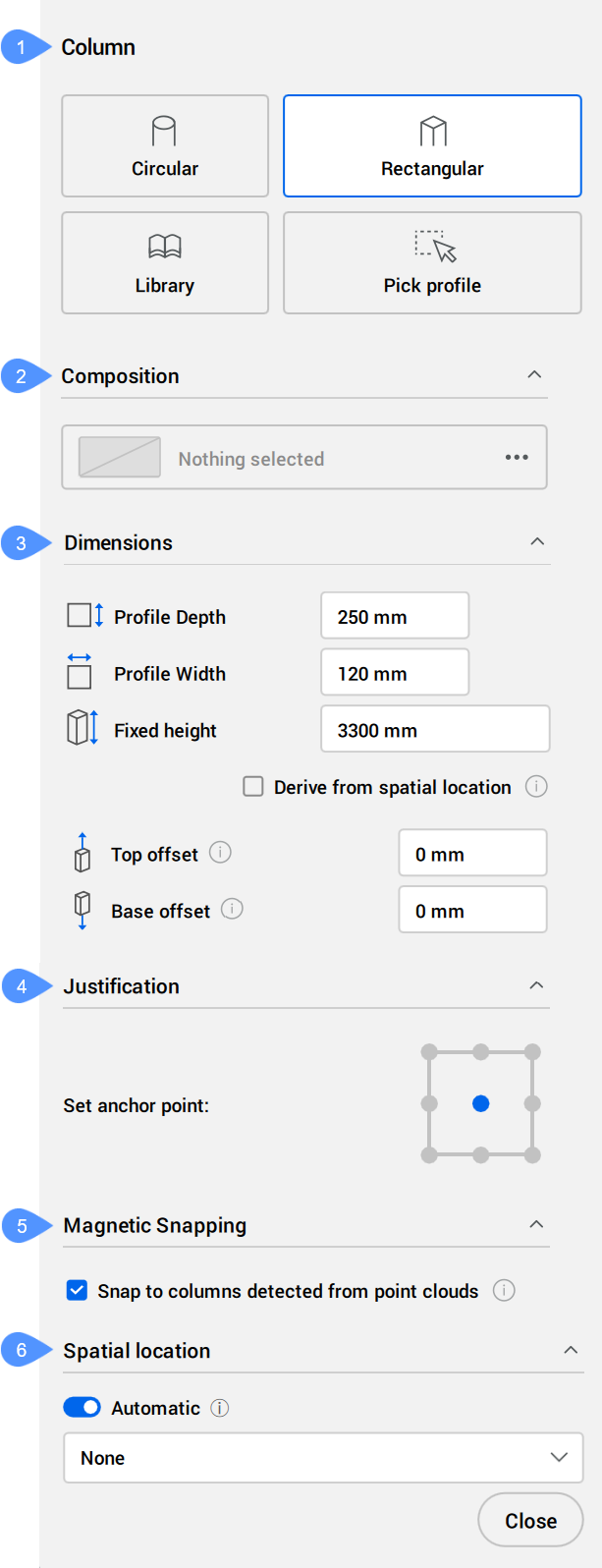 Der Befehl erstellt Stützen mit unterschiedlichen Formen. Sie können die Optionen über das Befehlskontext-Panel definieren, das beim Starten des Befehls geöffnet wird, sowie über die Befehlszeile.