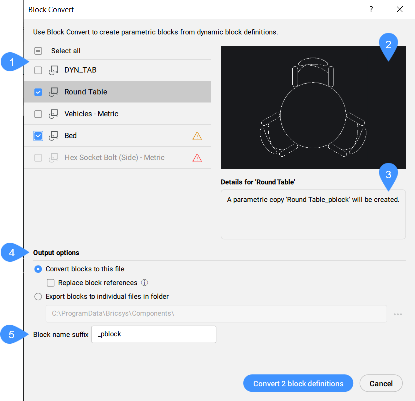 Sobald der Dialog Block konvertieren angezeigt wird, werden alle dynamischen AutoCAD® Blöcke der aktuellen Zeichnung aufgelistet. Markieren Sie alle zu konvertierenden Blöcke und spezifizieren Sie die Konvertierungsdetails (Ort, Suffix).