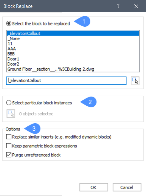 - Ersetzt alle modifizierten (anonymen) und nicht modifizierten Instanzen des dynamischen Blocks und alle Instanzen des ausgewählten nicht-dynamischen Blocks.