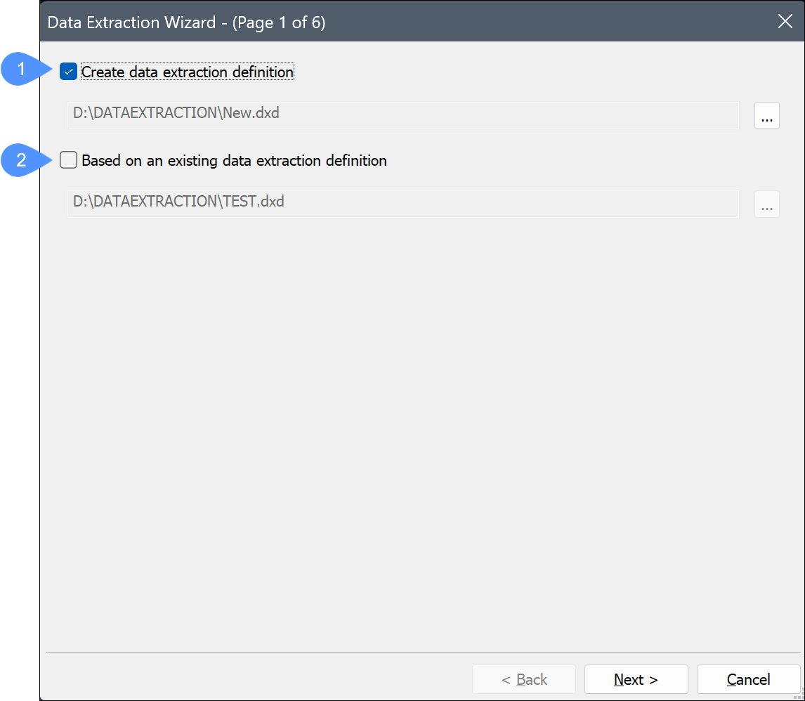 Verwendet eine vorhandene DXD-Datei als Vorlage für die neue Datei, um denselben Extraktionstyp in einer anderen Zeichnung durchzuführen oder die Datenextraktionsdefinition zu bearbeiten: