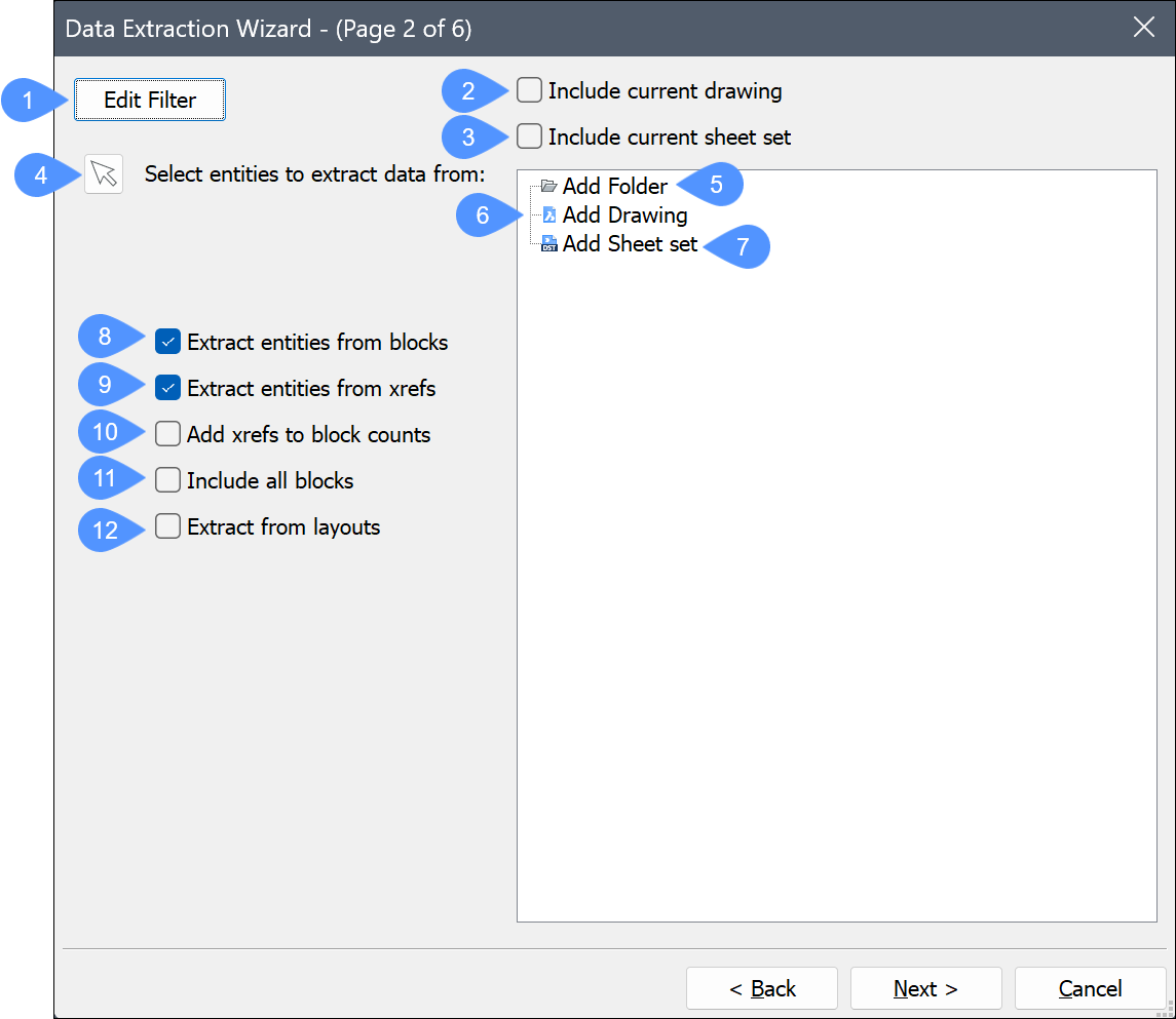 - Fügt die aktuelle Zeichnung hinzu, aus der Daten extrahiert werden sollen.