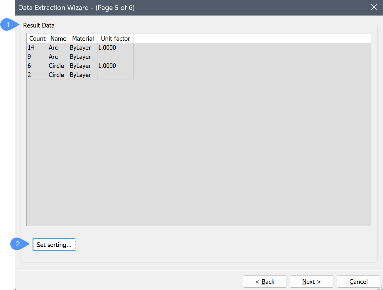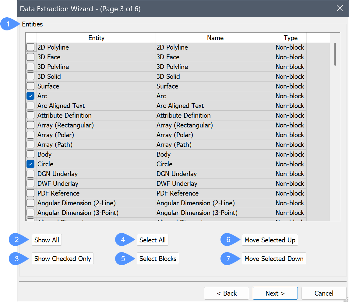 - Objekt: Listet die Objekttypen und Blöcke in der Auswahl gemäß den Optionen auf, die im Dialog Datenextraktions-Assistent festgelegt wurden.
